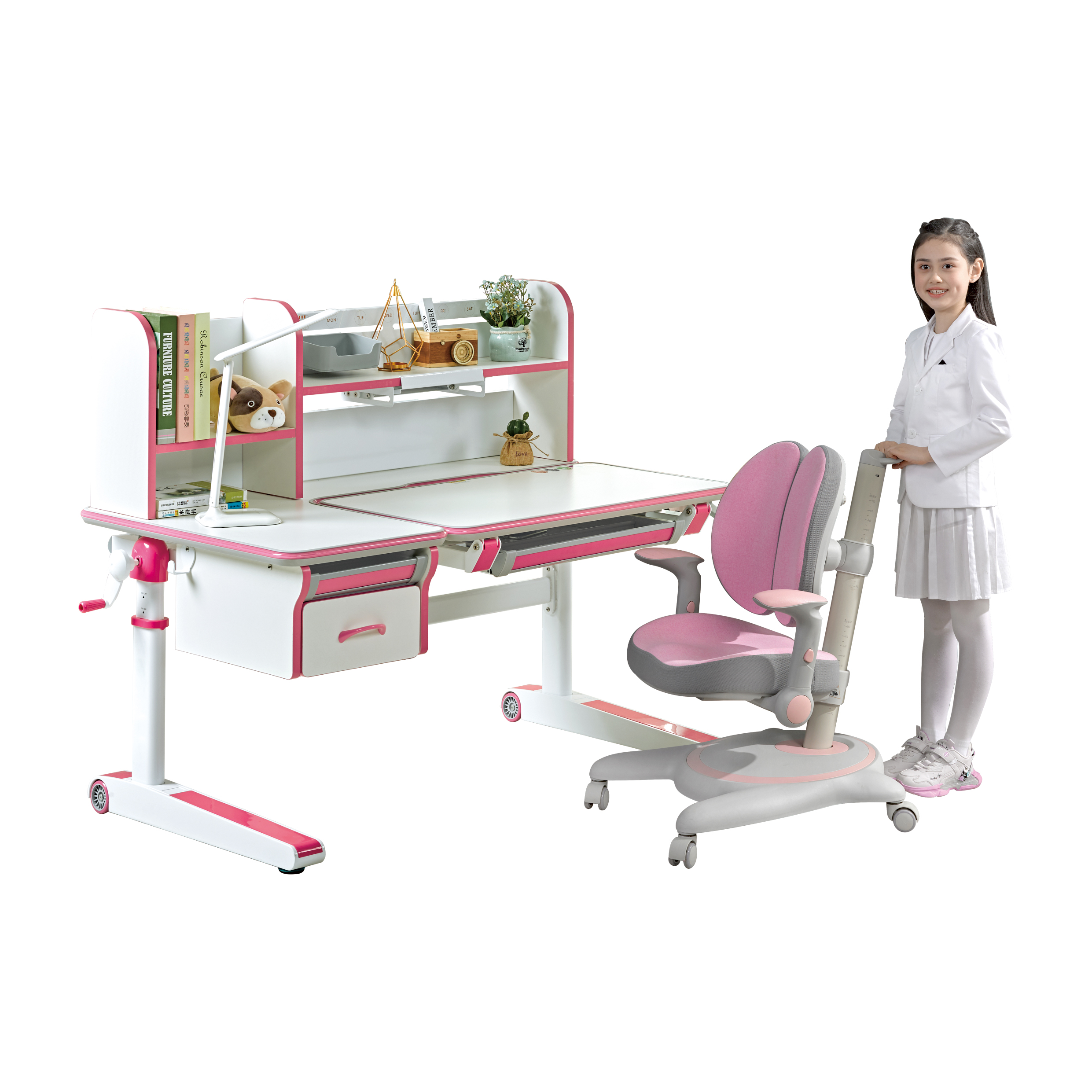 核心功能:桌面横梁内置物理传动装置,通过摇动摇柄即可轻松上升和下降;拉动线控手柄即可实现桌面无极角度倾斜,读书、写字、画画角度随意调节。 |