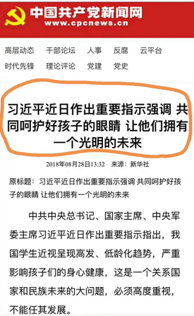 2018年8月28日习近平总书记关于学生近视科学防控的指示下达后,教育部、卫建委等八部委提出了实施方案,教育部与各省人民政府签订学生视力防控指标责任状,各省人民政府和各市人民政府签订责任状,不达标者启动问责机制。