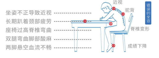 由于国家标准出台的时间长久,而且也缺乏相应的宣传,很多家长还是给孩子购置传统书桌椅。传统书桌高度是按照全国成年人平均高度设计的,一般是71-75厘米。用这种书桌,孩子只能坐到很高的凳子上才能够到桌面,造成两脚半空,导致腿部血液循环不畅,大腿发麻,只有不断的变换身体姿势才能缓解腿部不适。有时又因身体的晃动,不能持续的保持正确的用眼距离,这样的坐姿习惯极容易引起疲劳和注意力分散,伤害身体的同时还会导致学习效率下降。
